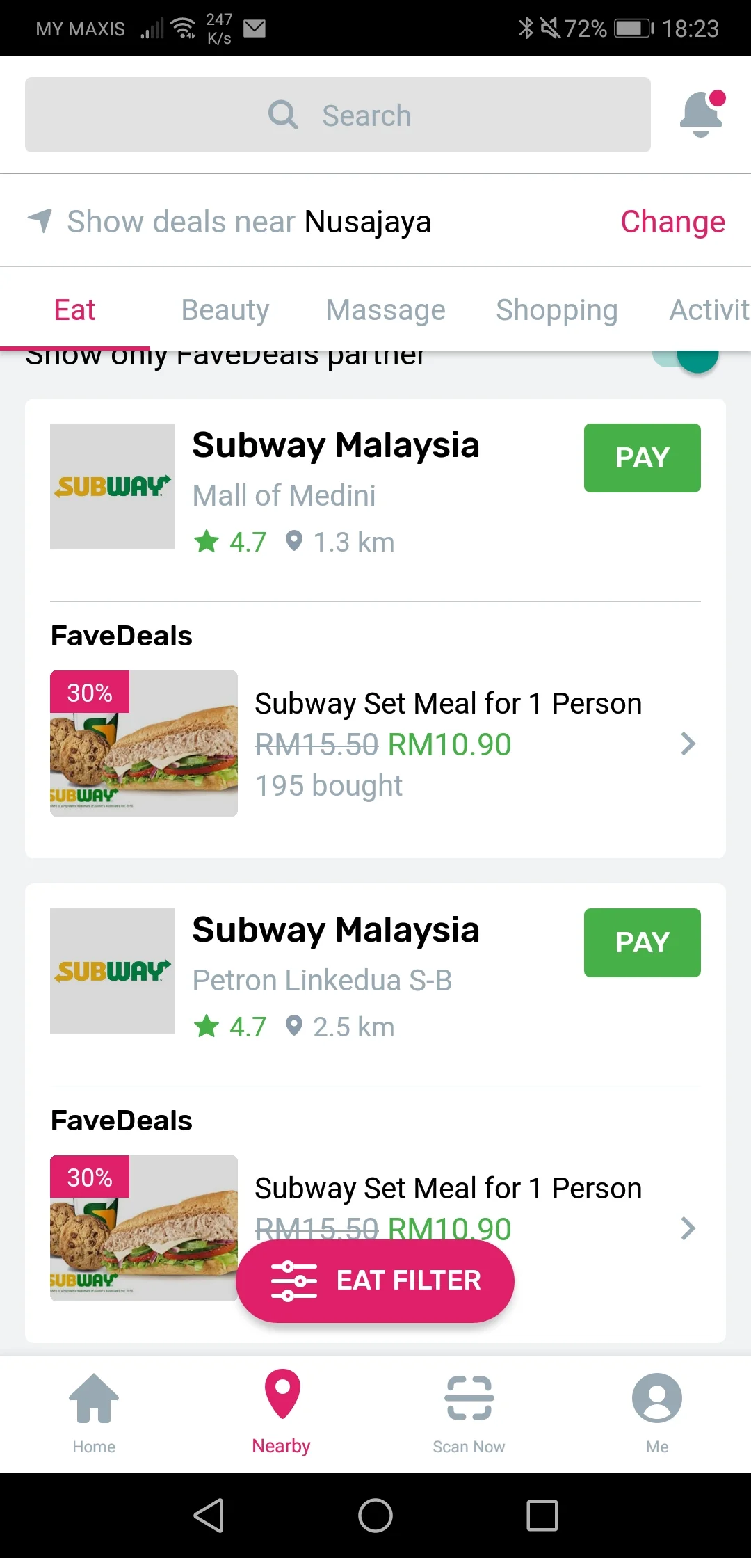 Next thing you want to do is to click ‘Nearby’. So, what you have here would be all the restaurants nearby at which you can take advantage of Fave Pay. If you want only the special deals (with discounts), click the tab saying ‘Show only FaveDeals Partner’ and you will see all the shops with special deals, only redeemable using Fave Pay.