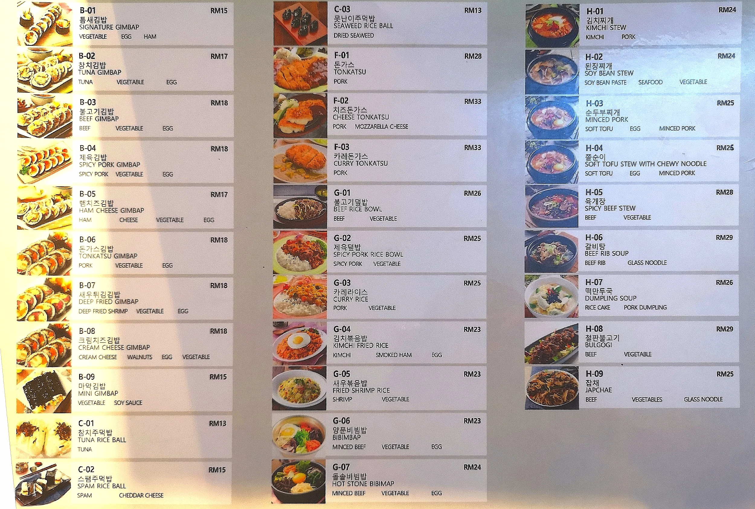 The total for our meal came up to be RM63, with the breakdown for the meal being: Signature Kimbap (RM15), Hot Stone Bibimbap (RM24) and a Kimchi Stew (RM24). The prices in the menu are all you pay - no additional taxes from my receipt. You will also get 3 side dishes - 1) kimchi 2) potatoes 3) pickles.