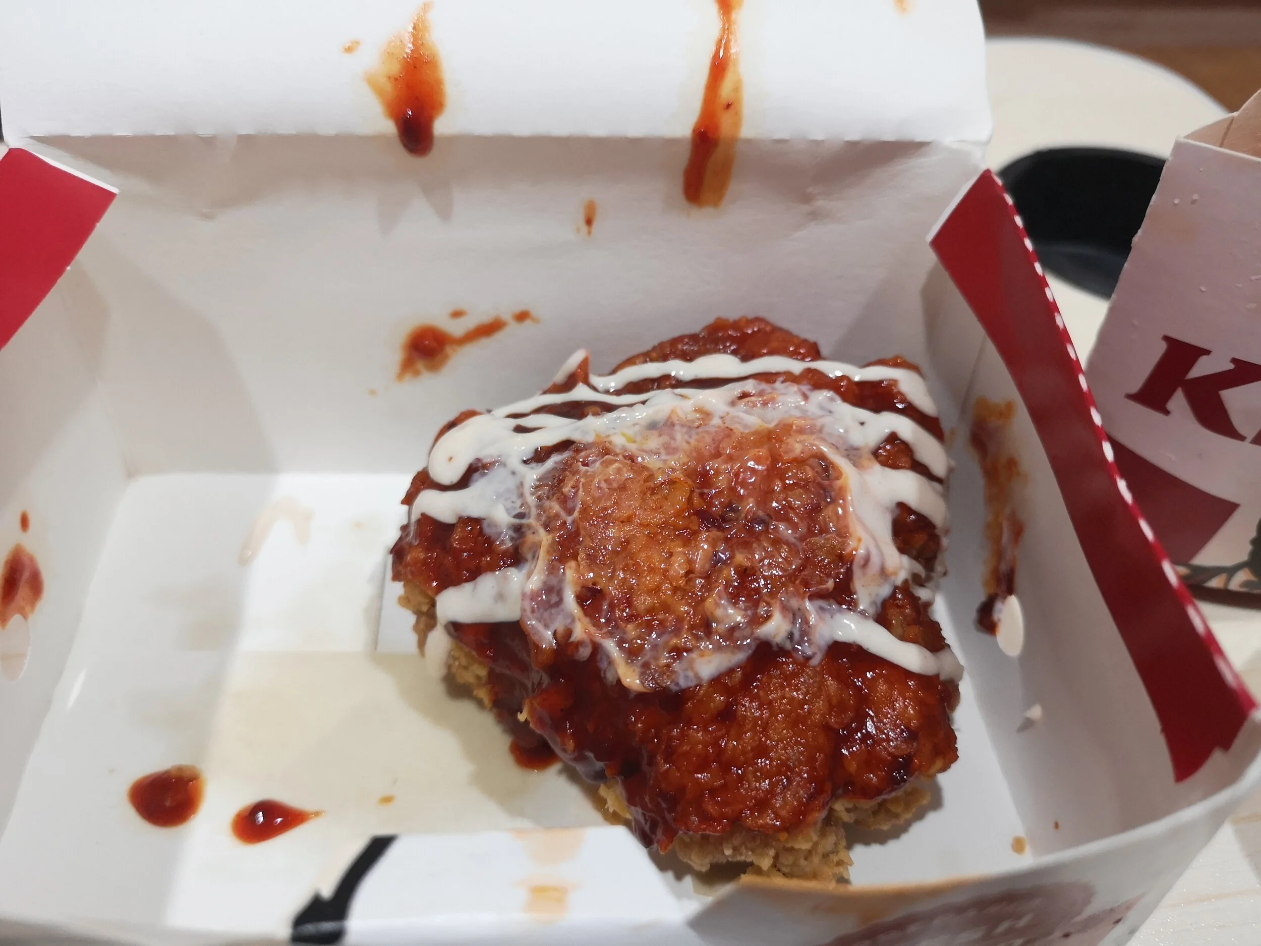 I will have to say that from advertising, you would think that it would at least be drenched with their hot sauce glaze over the exterior of the ENTIRE chicken (literally look at the pictures and the video - the man is LITERALLY eating from the side of a normal KFC chicken judging by the video but I’ll let it pass.