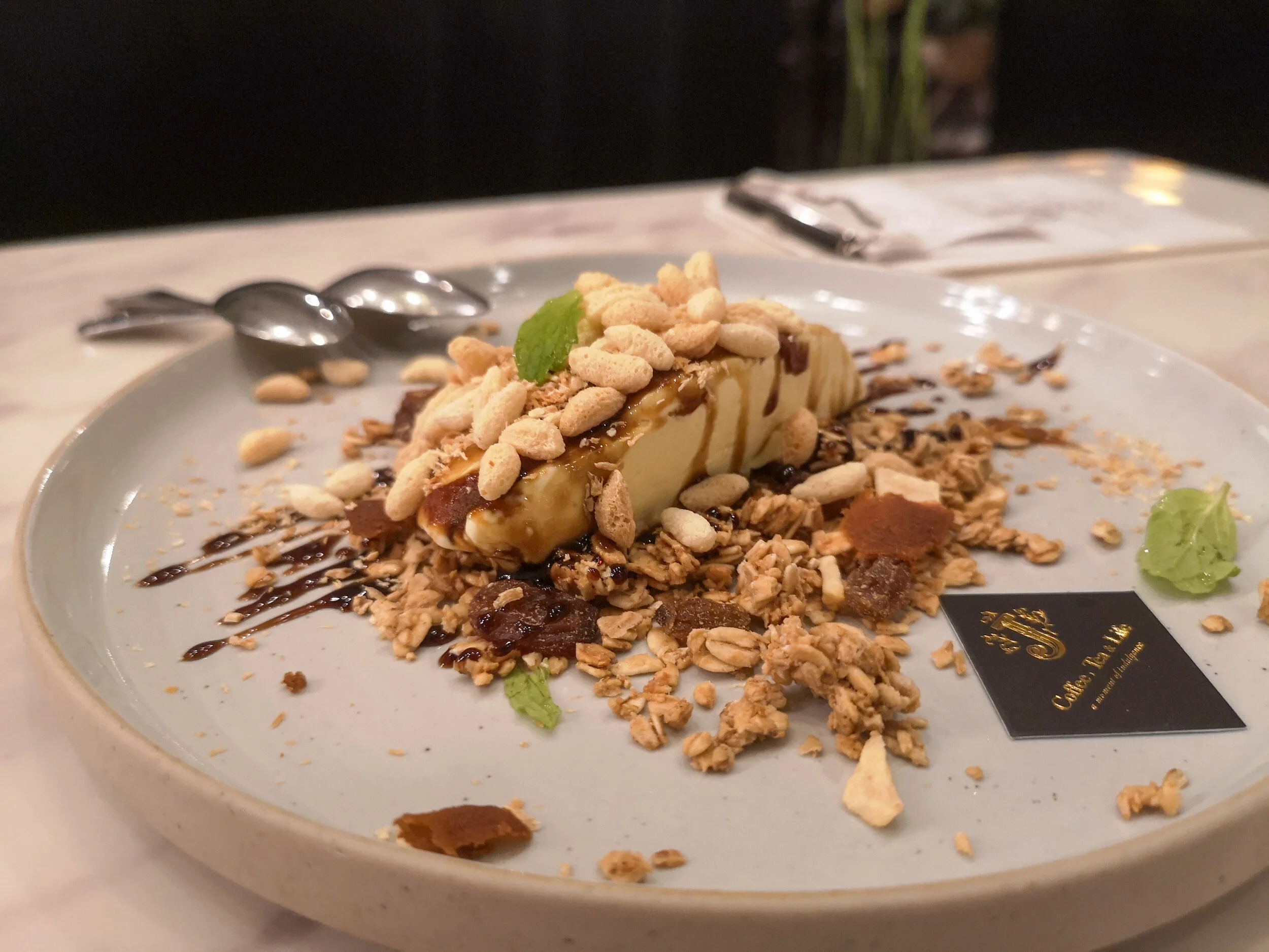 For the Panna Cotta, I would almost describe it as a very ‘breakfast style’ kind of dessert. The reason I say it is because I would say that the strong elements of the dish would be the Gula Melaka and all the nuts and oats rather than the Panna Cotta itself. I’m personally more of a fan of either hot desserts (eg. tarts) or cold desserts (ice creams) but this one falls sort of in the middle of that, so there’s that component too.