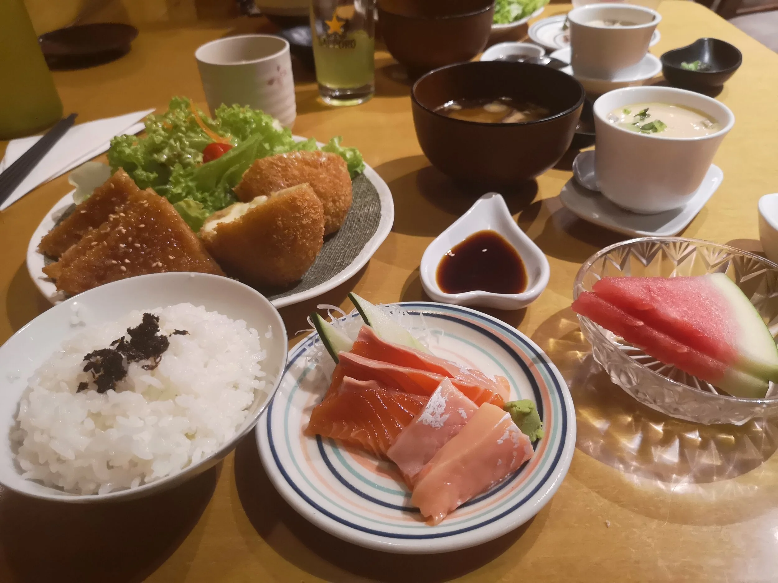I personally thought it was nice. The homemade tartare sauce is lighter than I expected, so I feel like it isn’t one of those that you keep eating and get sick of. Then you have 5 thick and delicious pieces of salmon sashimi, some kind of salmon appetiser (I would say that you kinda need to appreciate fishy tasting food in order to like that dish), a meh Chawan Mushi, two pieces of watermelon and a Miso Soup that is pretty hearty (has pieces of what I think is fish and other bits and pieces inside).