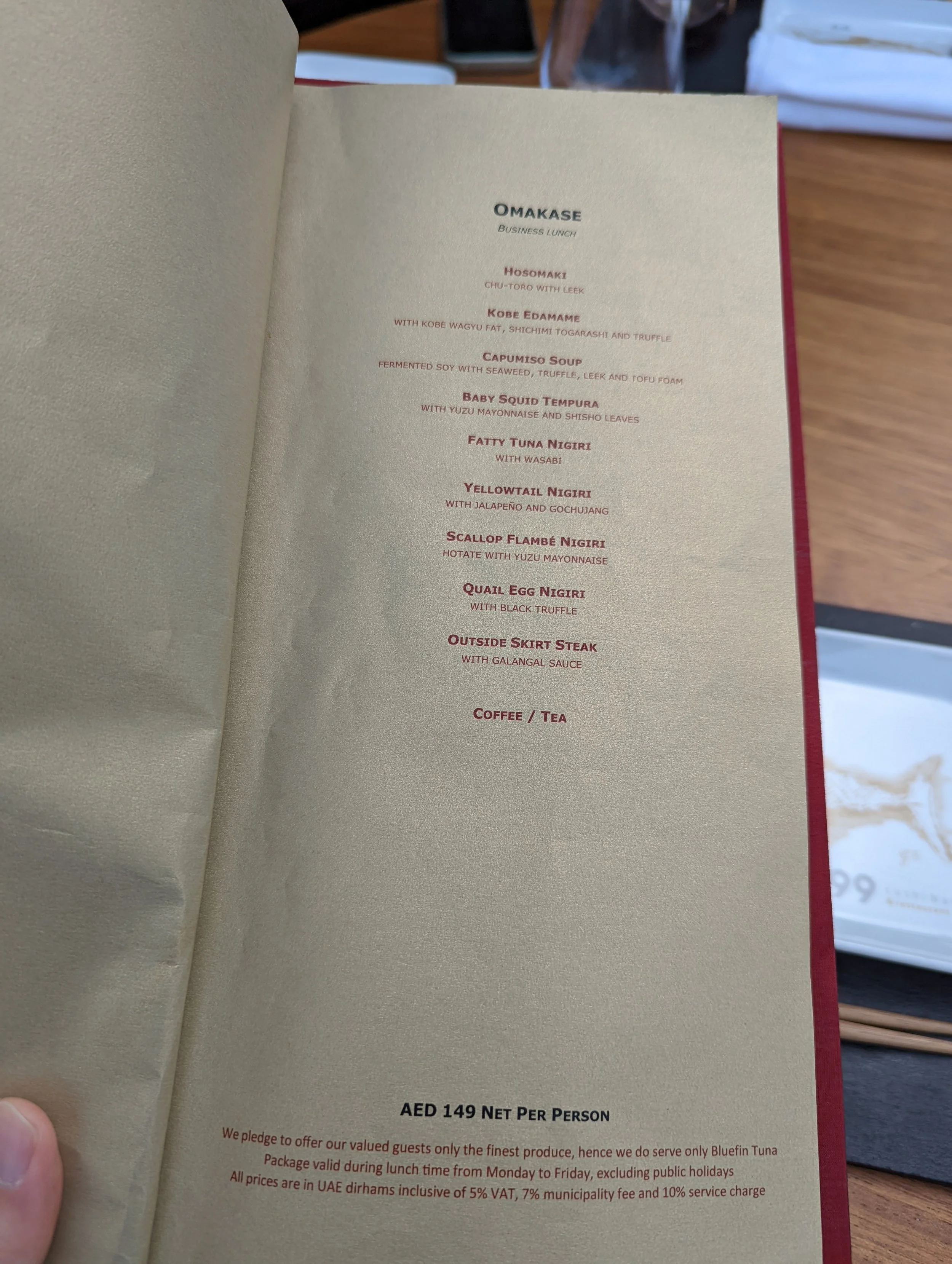 The basis business lunch set is AED149 nett (after taxes) and we had a large bottle of sparkling water to share (AED30). There’s a 7% municipality fee & a VAT of 5%, but all menu prices have already accounted for this - so there’s no additional charge on top of menu prices.