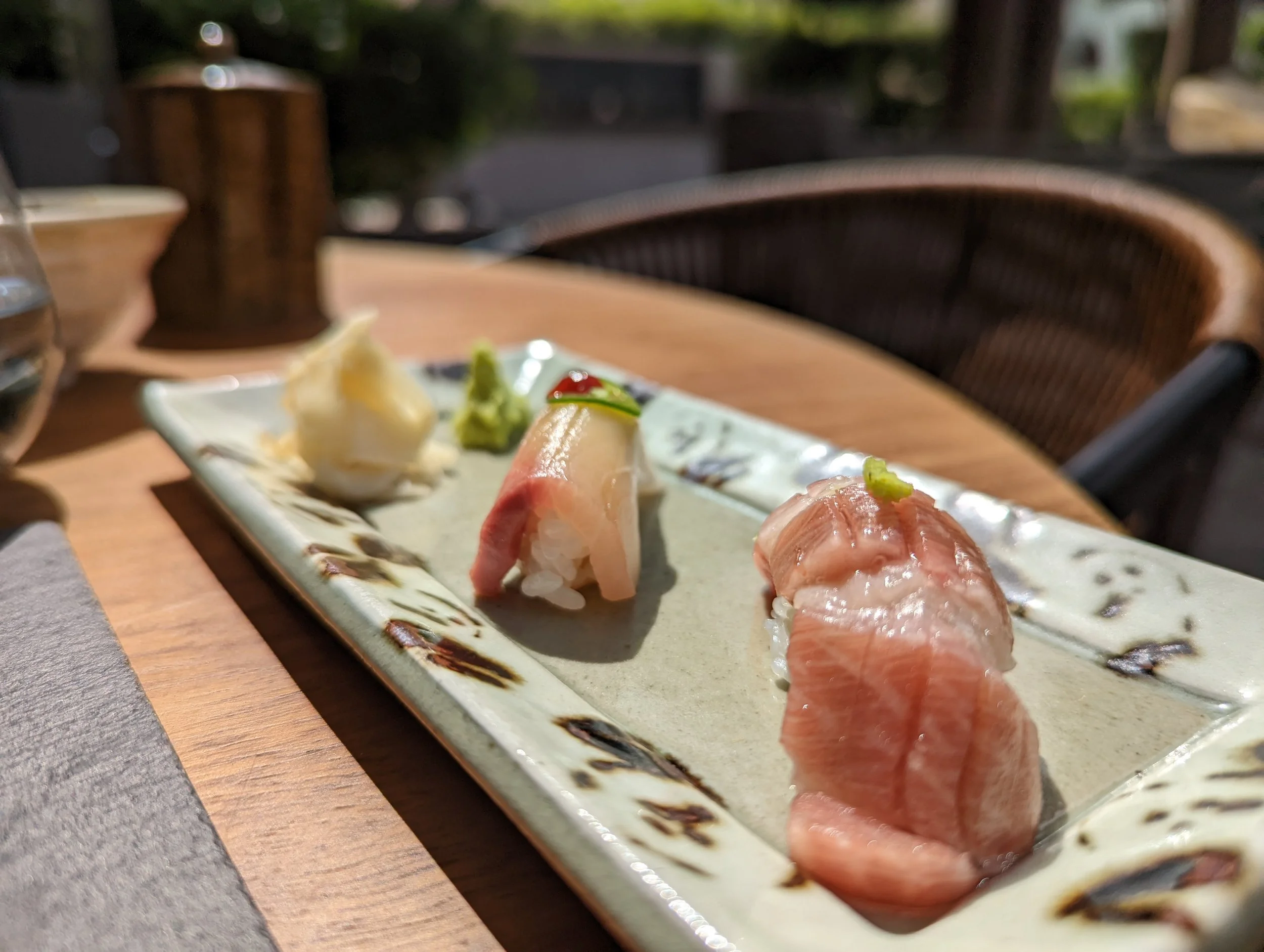 Next up, you have the 2 nigiri served together. The fatty tuna and the yellowtail nigiri. The fatty tuna has the classic melt-in-your-mouth quality to it - and it has a really nice marbling to it. The yellowtail nigiri is decent as well. They have some jalapeno and gochujang accompanying the yellowtail nigiri and I think it’s so-so in terms of how it pairs with the yellowtail nigiri overall.