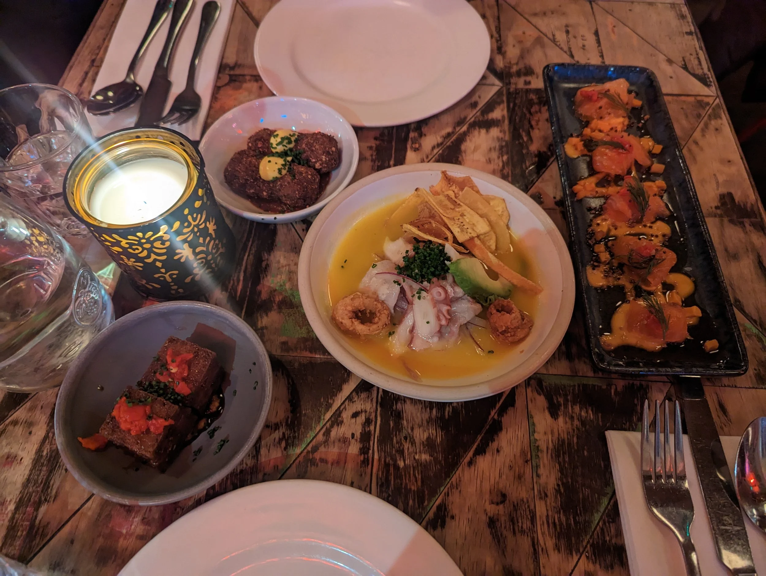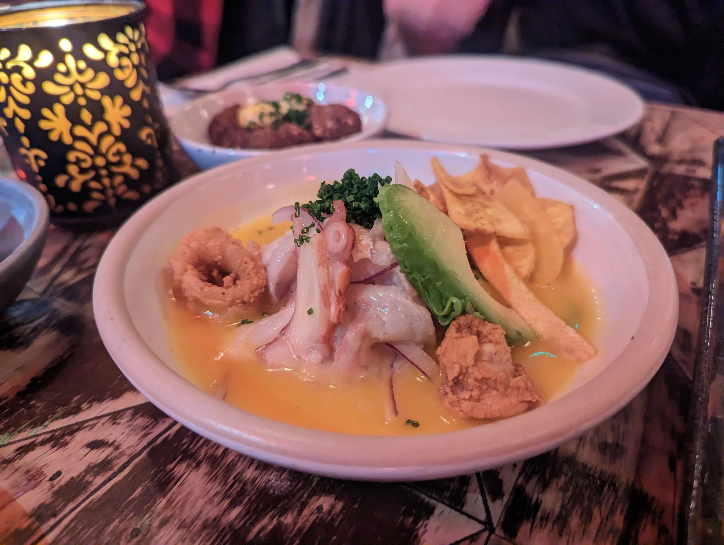 The first four dishes on the table were the quinoa croquetas, the chifa chicharrones (pork belly), senor ceviche, and the salmon tiradito.