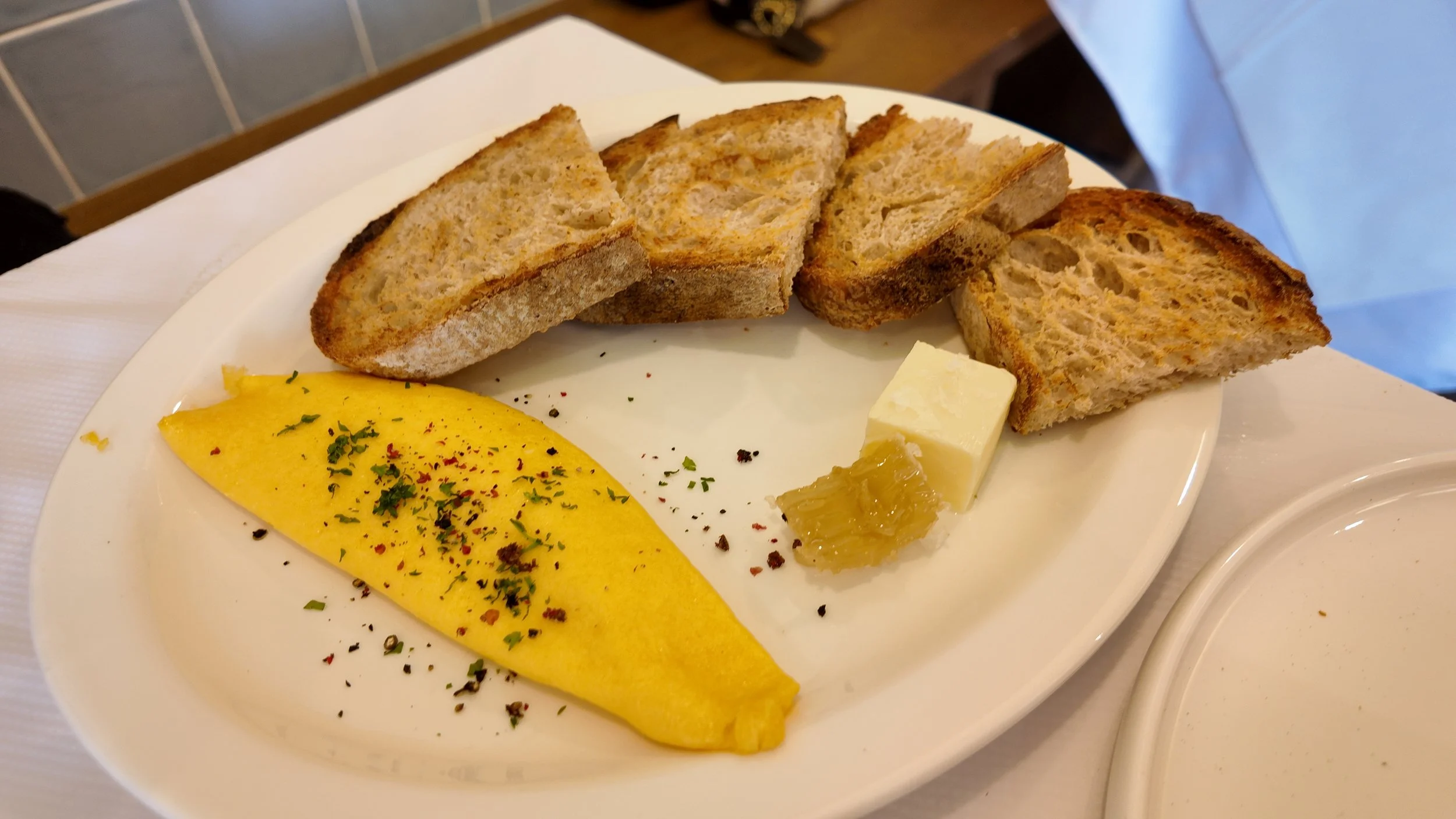 So, for what I would say is their main attraction: their sourdough bread with 2 sides. I went with an omelette and honey with butter as my spread. I would say on a scale of very airy to hard and crunchy, I would say that the sourdough is definitely a bit more on the crunchier / crispier end. The bread was fresh, warm and nicely toasted - so definitely a spot that sourdough lovers will definitely appreciate. It sounds almost simple, to have it paired with butter and honey, but I think it’s a simple combination that is done really well. The French style omelette is also super elegant, folded neatly onto the plate. I like the idea that you can really customize that dish - how many sides you want, and what you want as your sides, including sausages, other types of eggs, etc.
